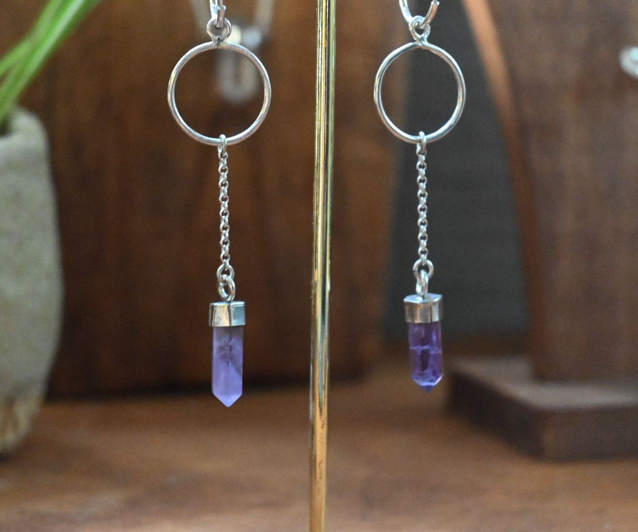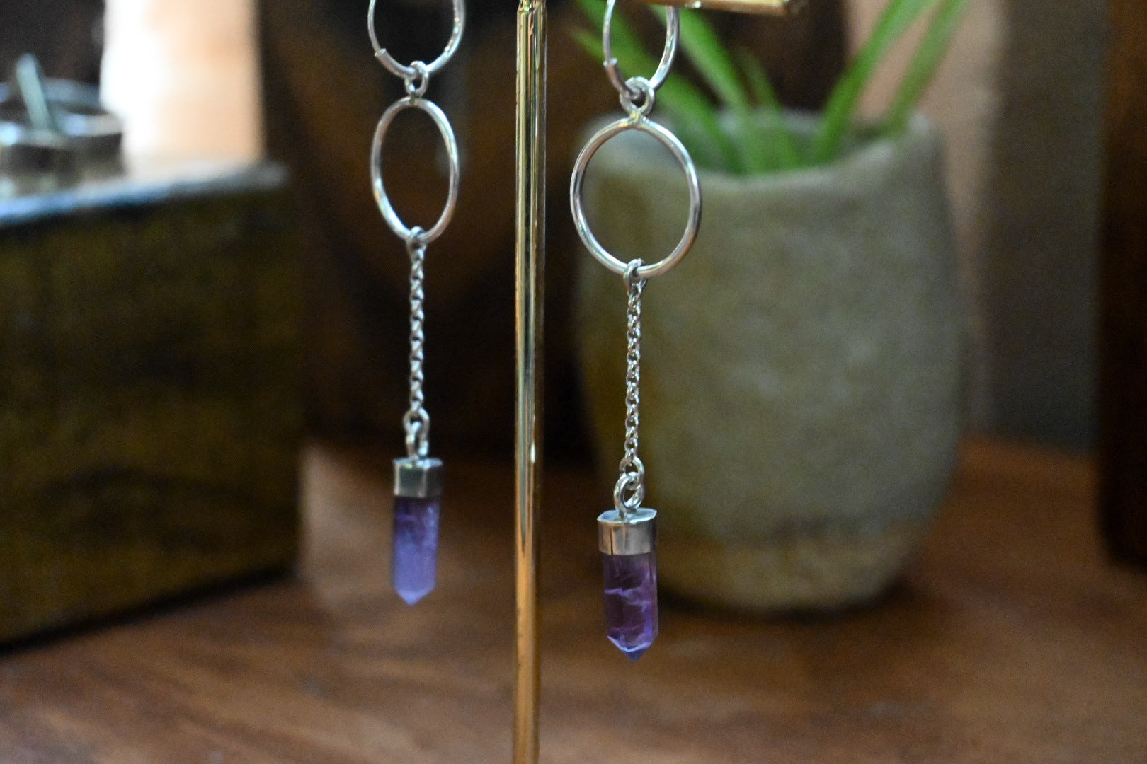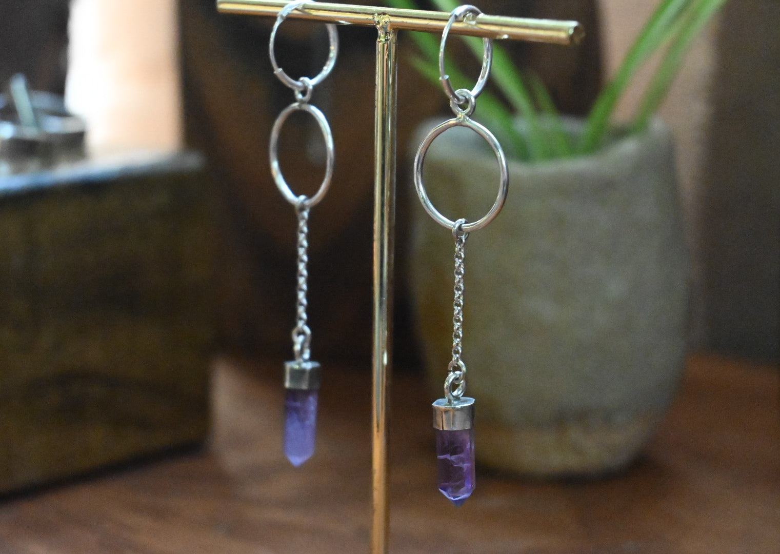 Pendientes en plata 950, con puntas de amatista natural que cuelgan de finas cadenitas móviles, creando un juego de luz y movimiento sutil.