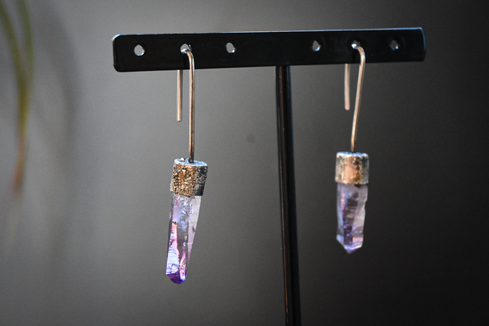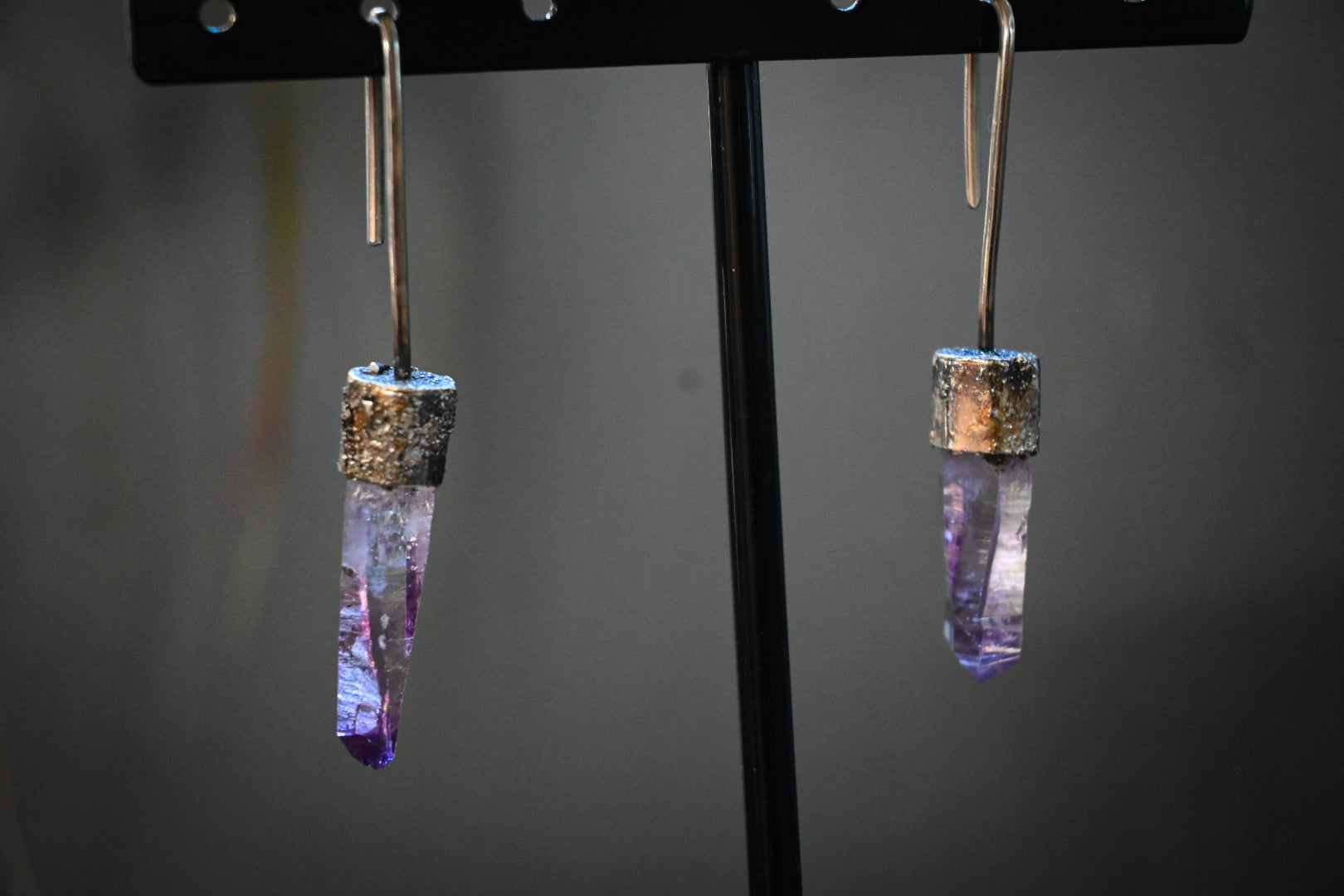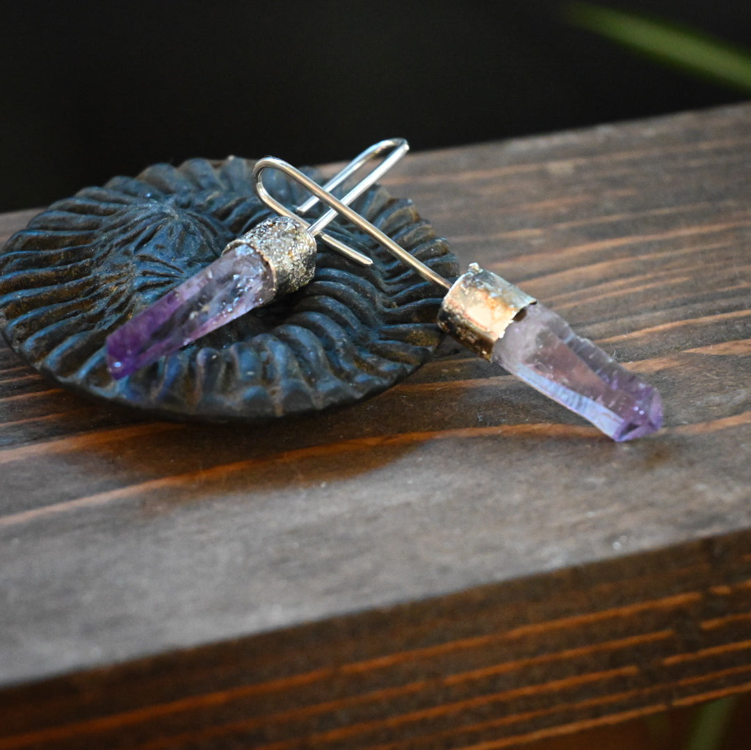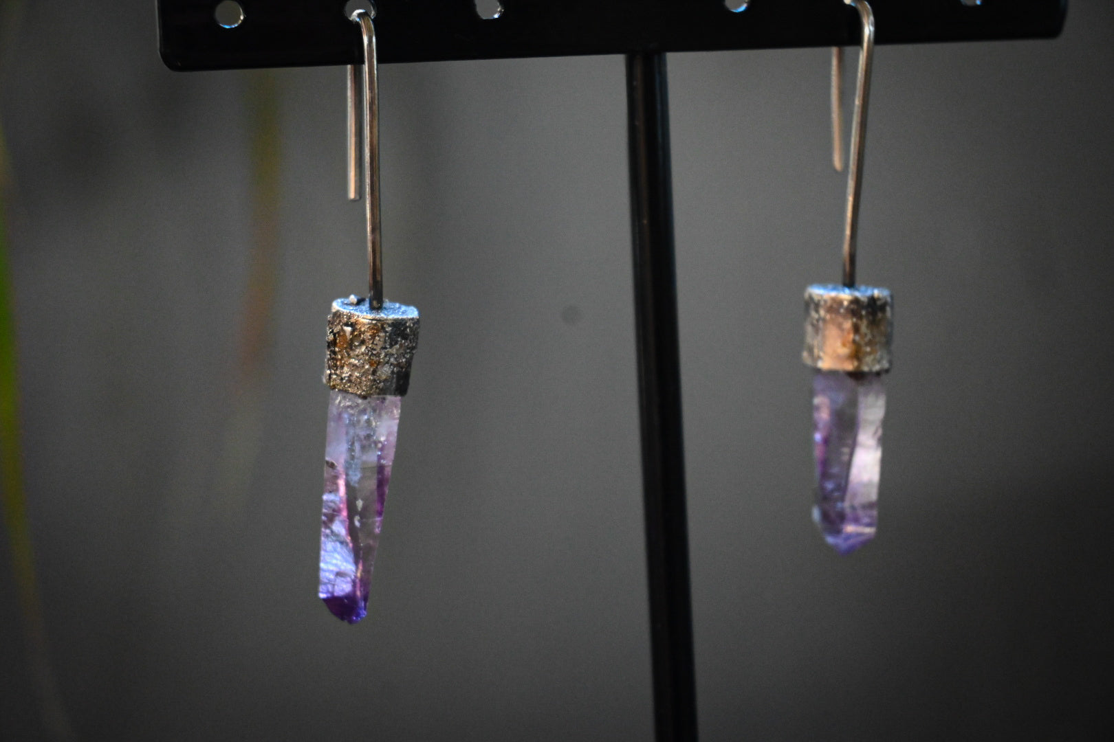 Pendientes artesanales en plata, con puntas naturales de amatista mexicana, conocidas por su color violeta profundo y magnético.