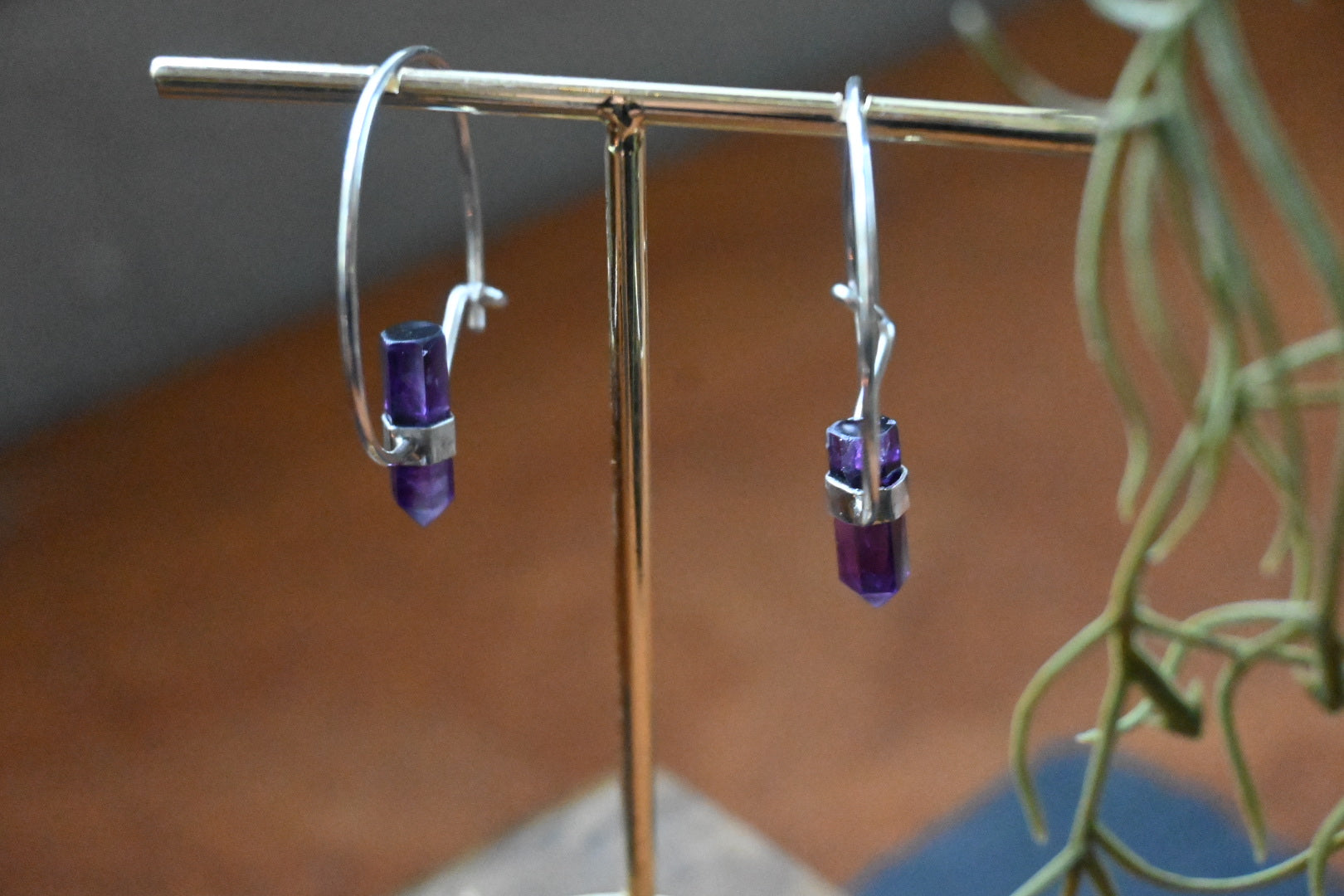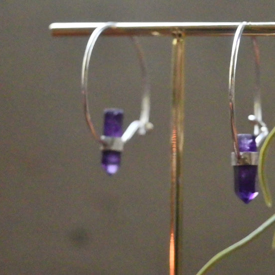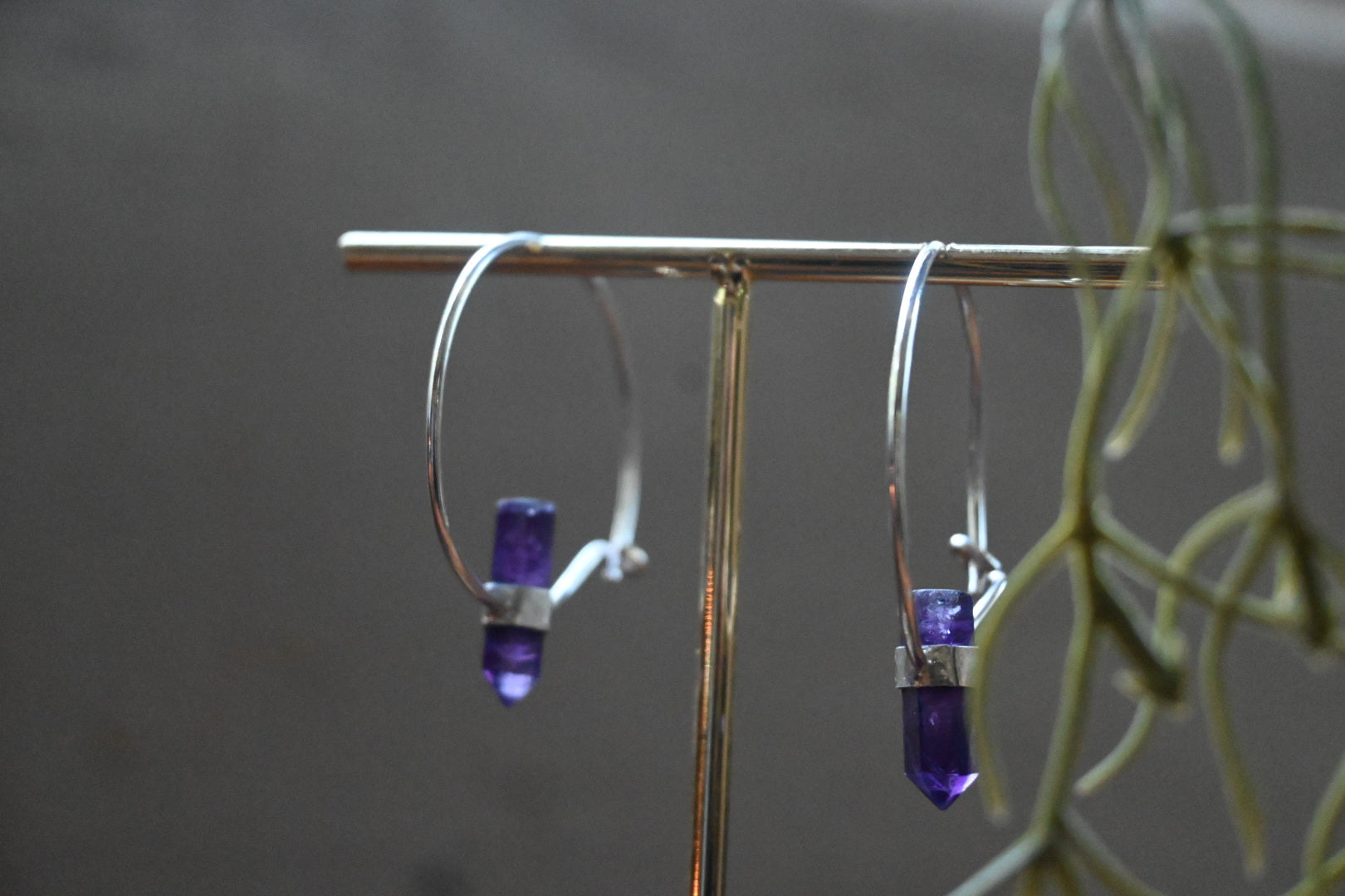 Sutiles, ligeros y llenos de energía, estos pendientes en forma de aro están forjados a mano en plata de ley y decorados con puntas naturales de amatista.