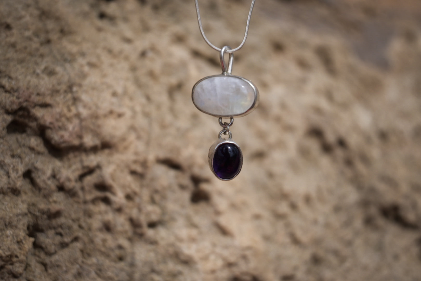 La piedra de luna simboliza la intuición, la feminidad y el equilibrio emocional, mientras que la amatista aporta claridad mental, serenidad y protección espiritual.