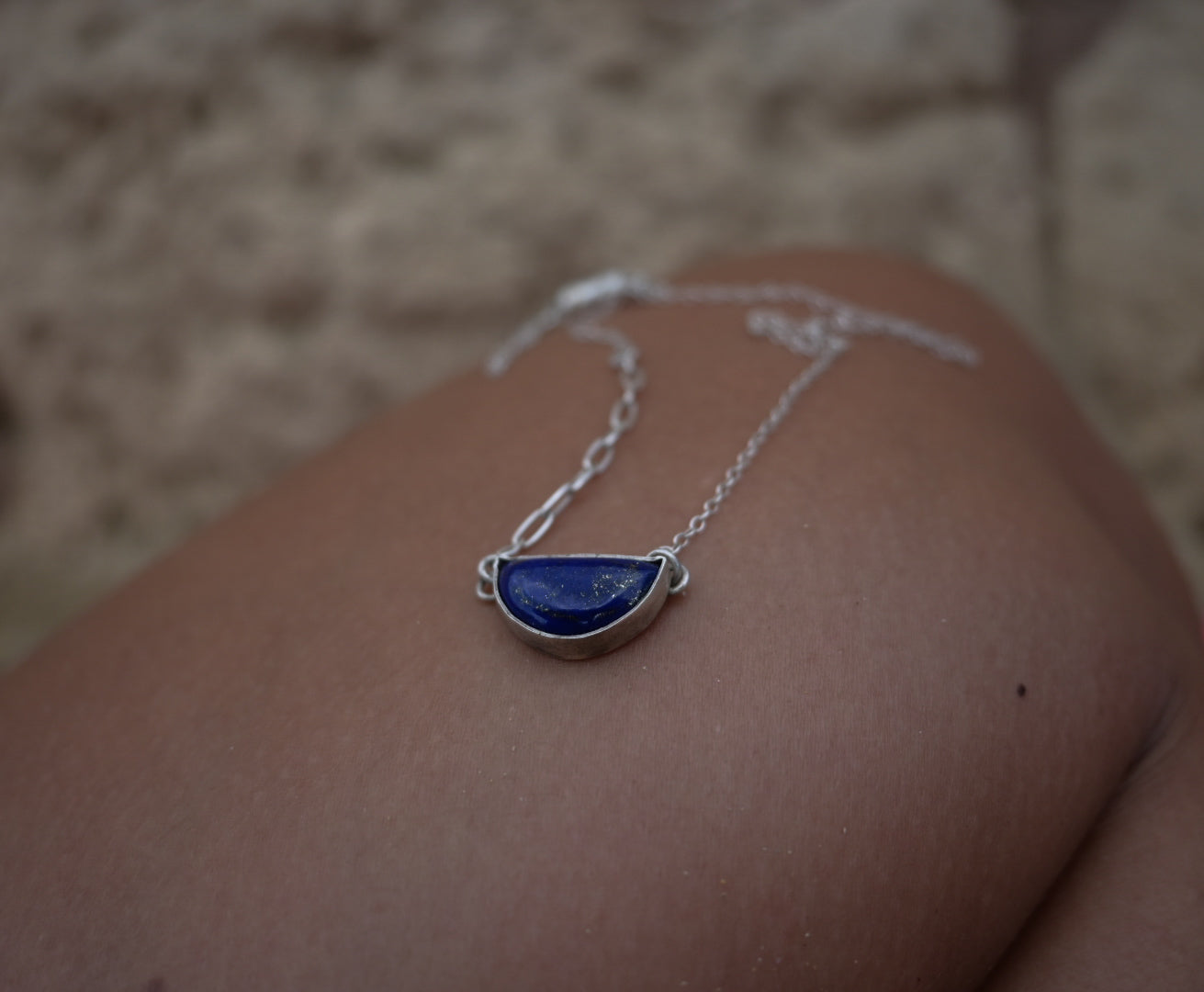 Collar tipo choker artesanal en plata, de diseño simple y contemporáneo, que resalta la intensidad azul profunda del lapislázuli.