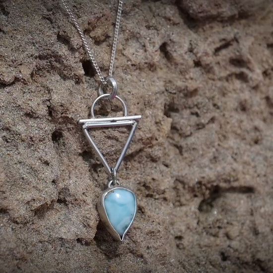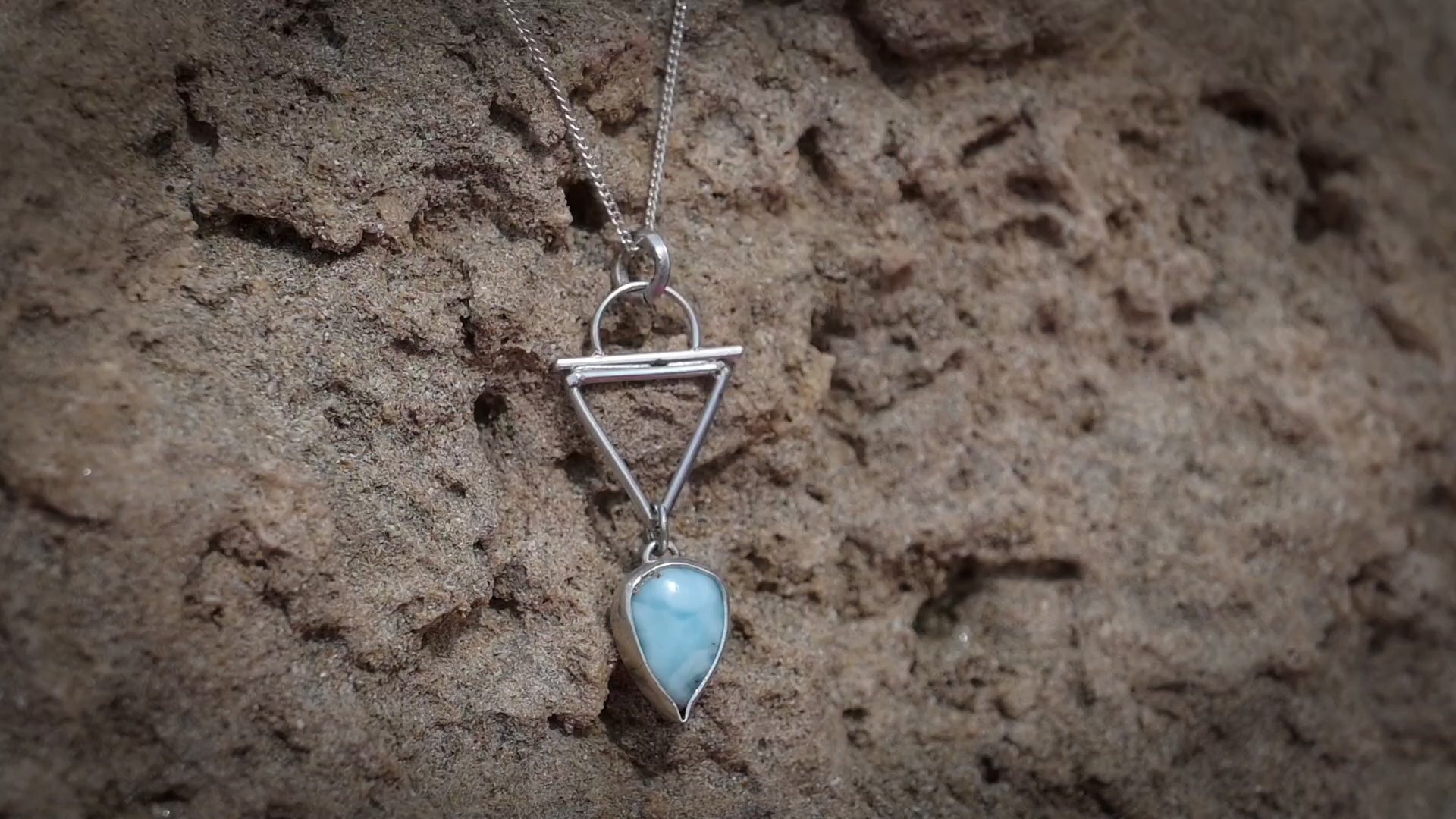 Joya artesanal en plata, de forma triangular, que sostiene en su centro un larimar —piedra semipreciosa única del Caribe, conocida como la “piedra del mar” por sus suaves tonos azul celeste y su energía calmante.