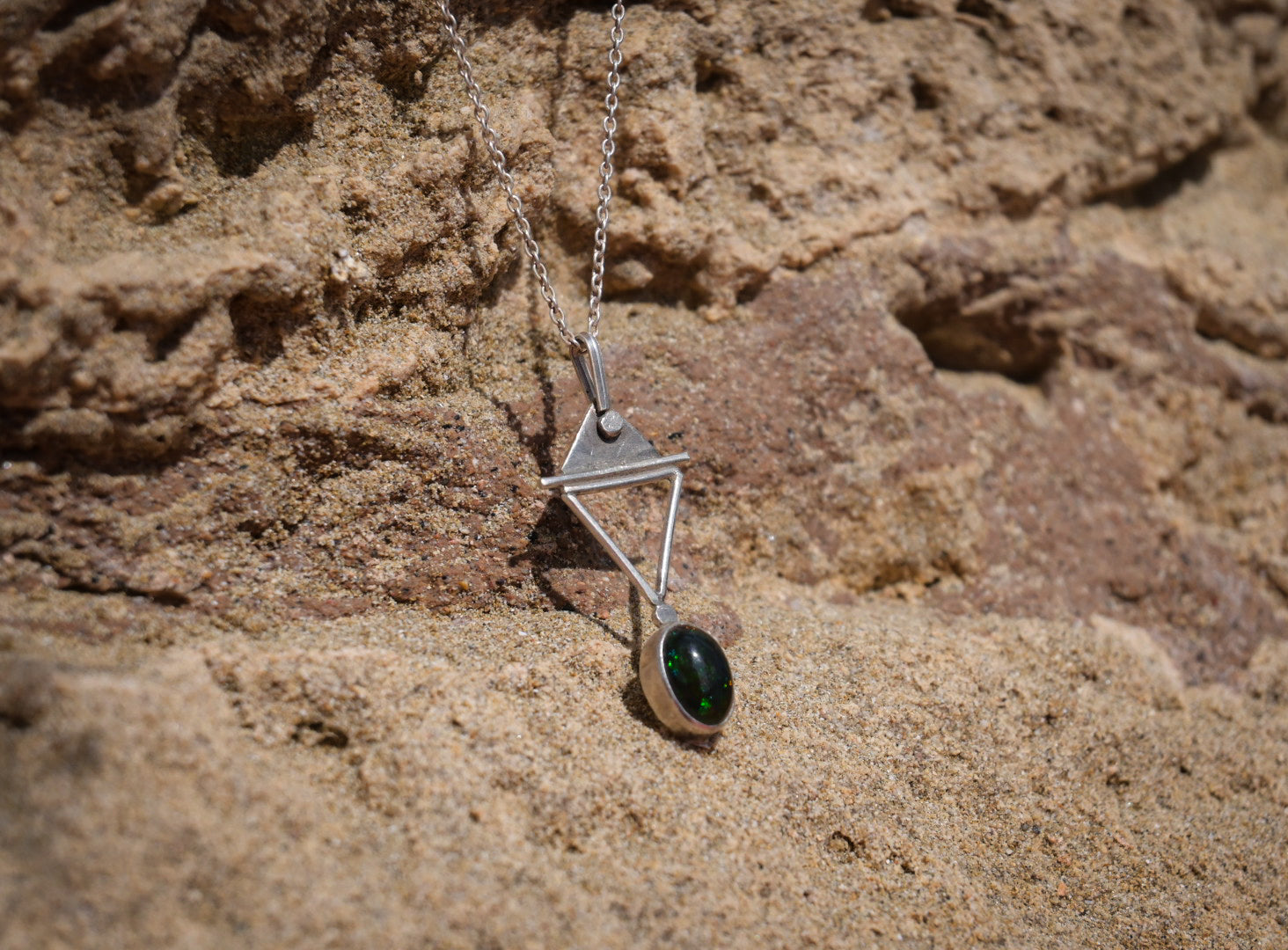 Joya de plata hecha a mano, con un diseño geométrico que realza la profundidad y misterio de un ópalo negro natural.