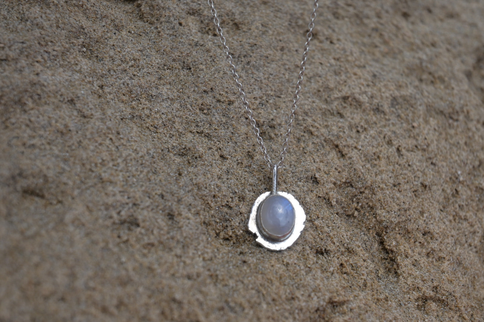 Joya de plata hecha a mano, con un diseño sencillo y atemporal que realza una piedra de luna natural.