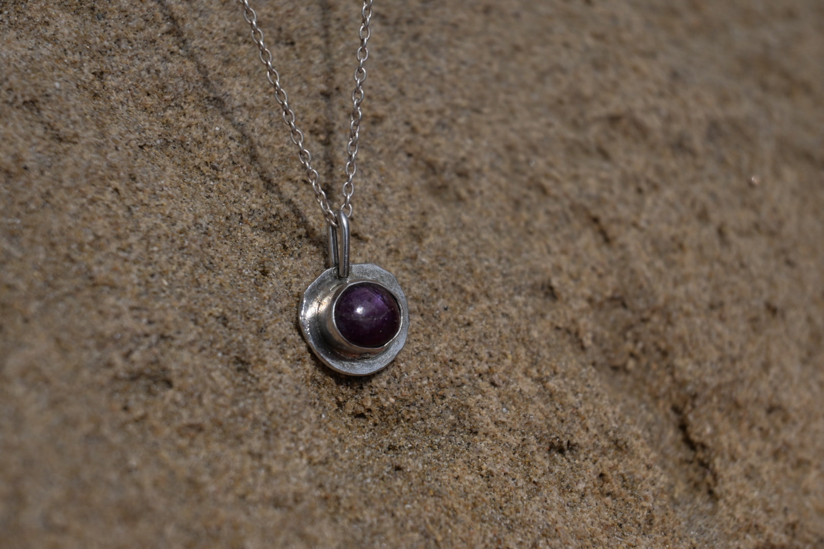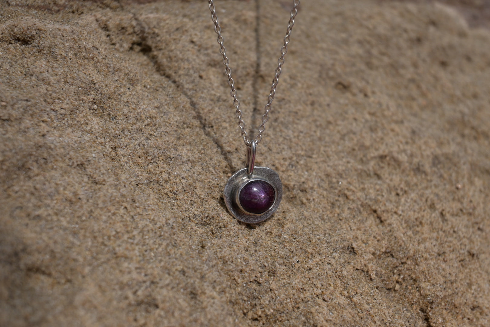 Joya artesanal en plata, con un rubí estrella en el centro —una gema fascinante que revela un brillo en forma de estrella cuando la luz la acaricia.